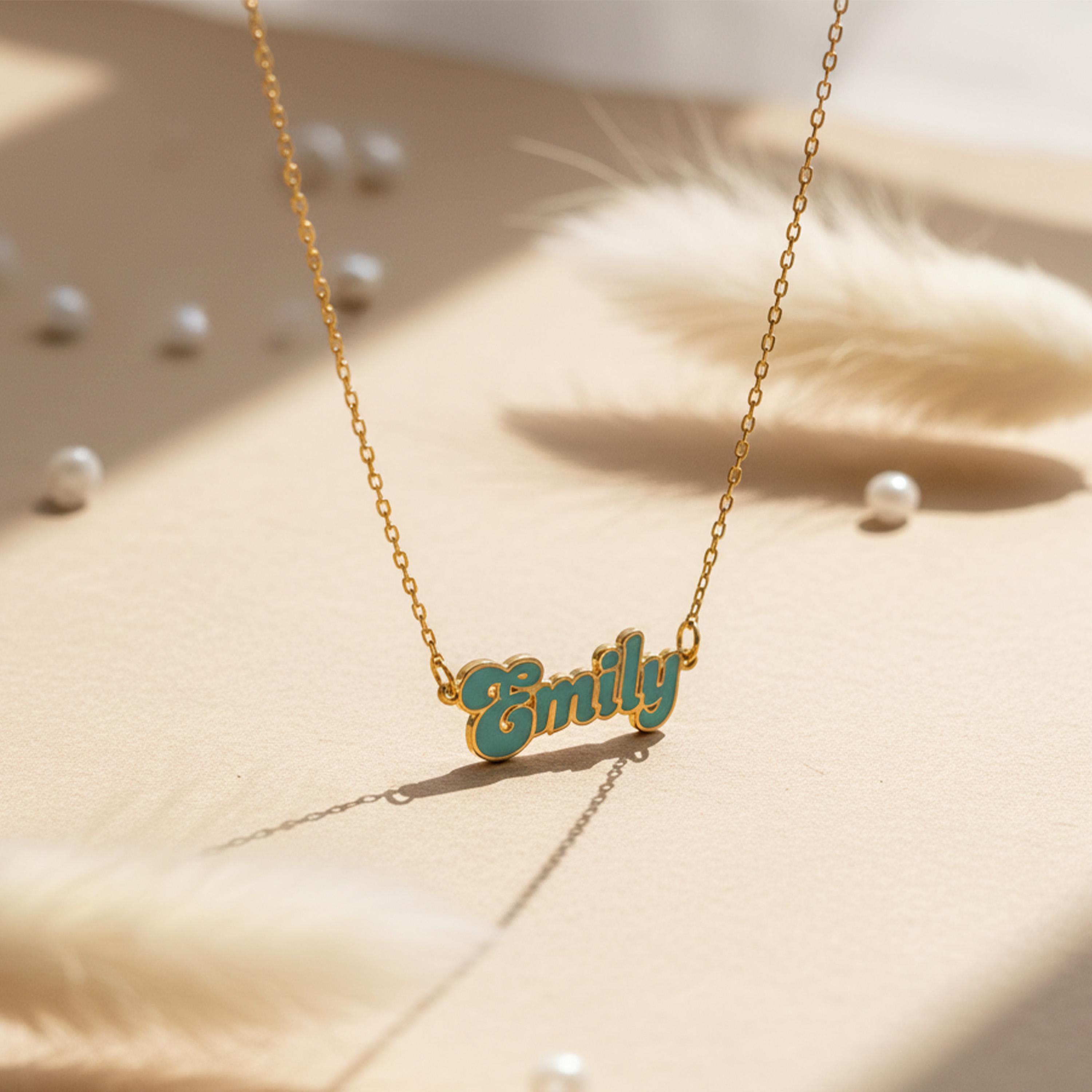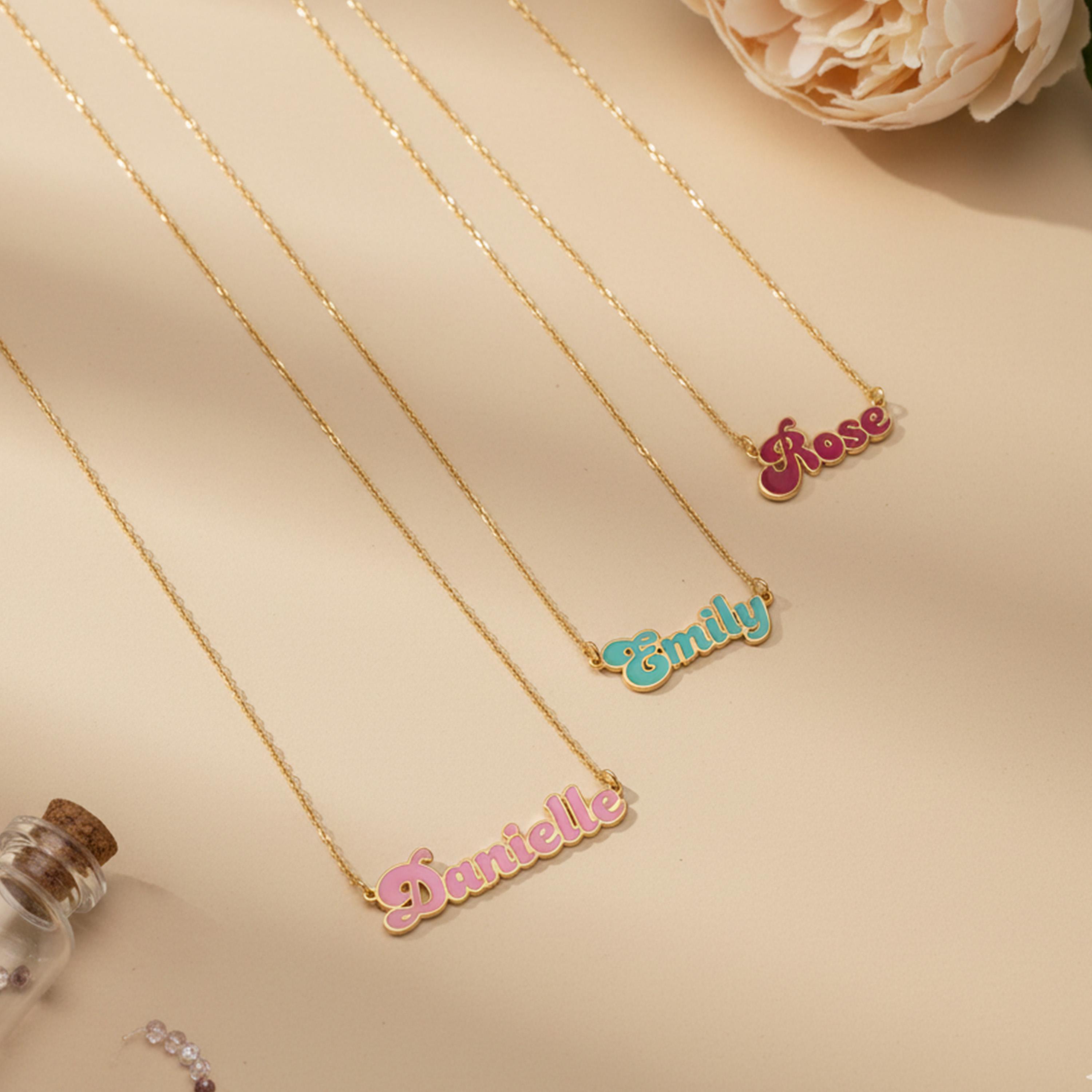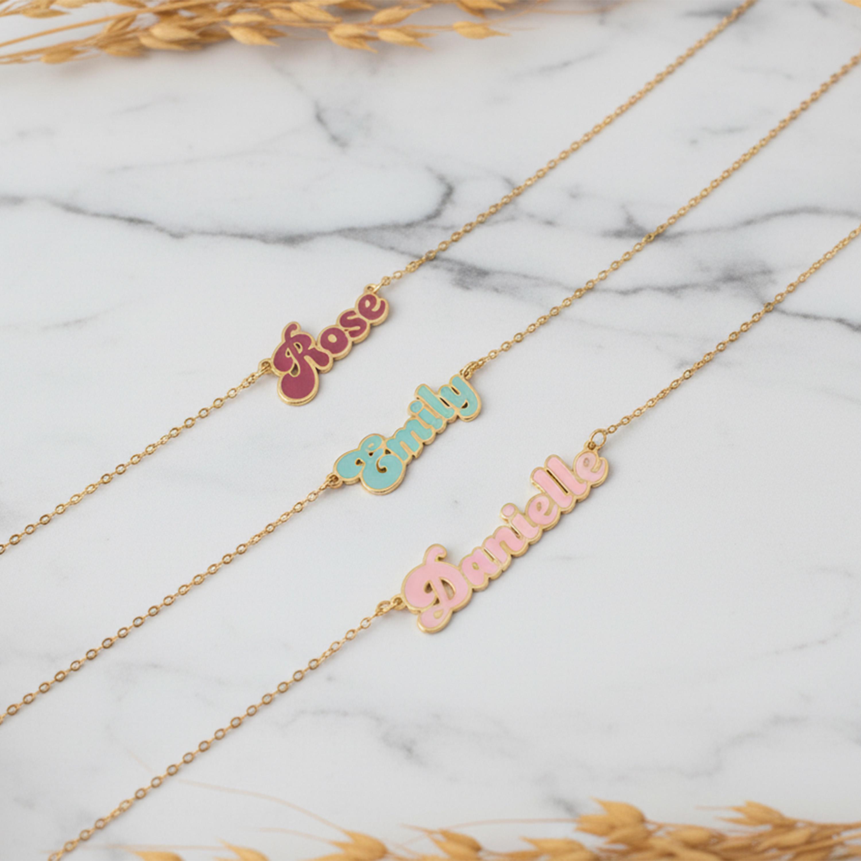 🟡 Customizable Name Design: Choose any name to be featured in vibrant enamel-filled letters with a stylish retro font