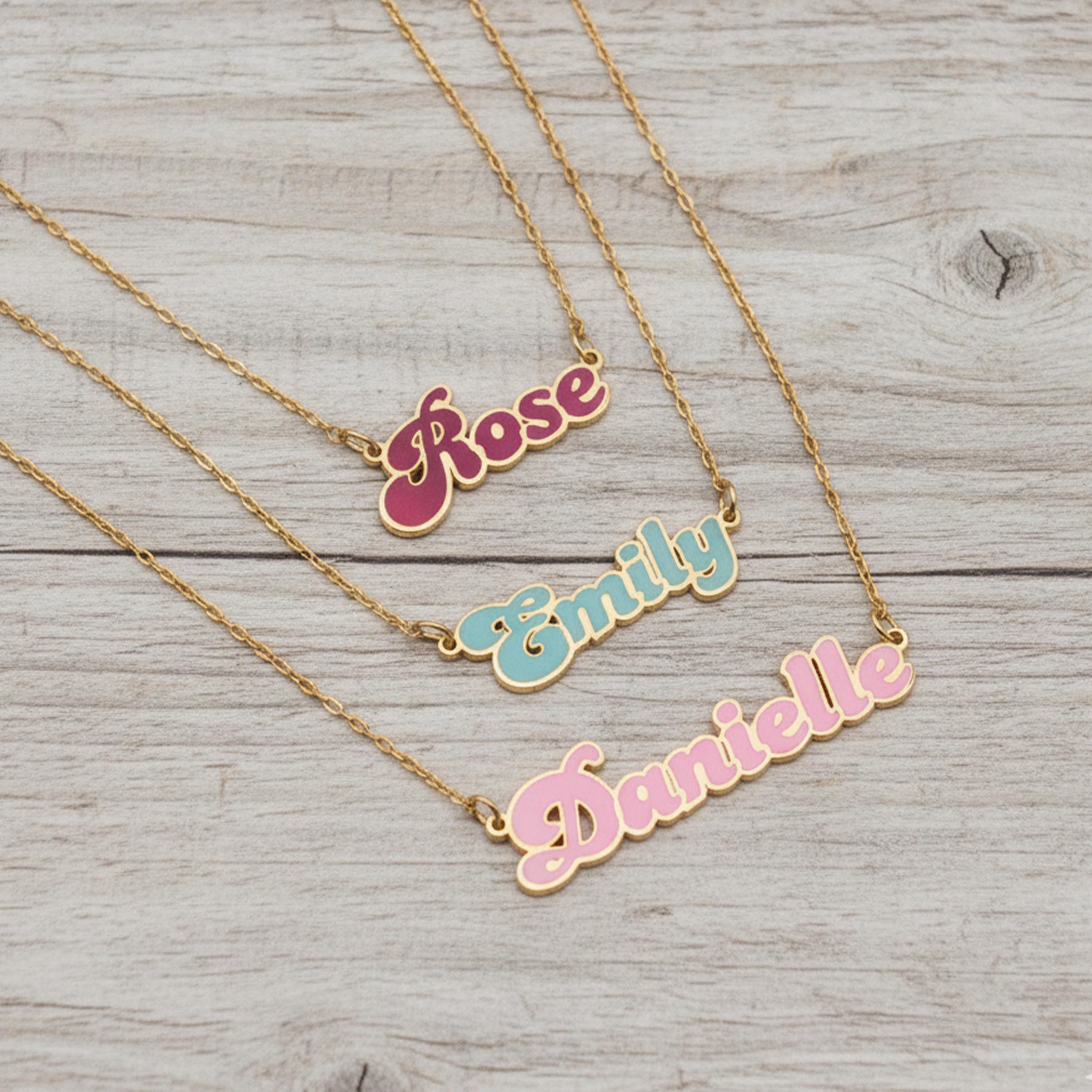 https://riverwalkgiftshop.etsy.com/listing/4364990301/custom-enamel-name-necklace-gold-retroAdd a pop of personality to your jewelry collection with this retro-inspired custom name necklace! Featuring bold, colorful enamel lettering and a dainty gold chain, this personalized piece makes the perfect gift for her 🎁✨ Whether you're shopping for a birthday, anniversary, or just to treat yourself, this necklace is sure to stand out with style and sentiment.